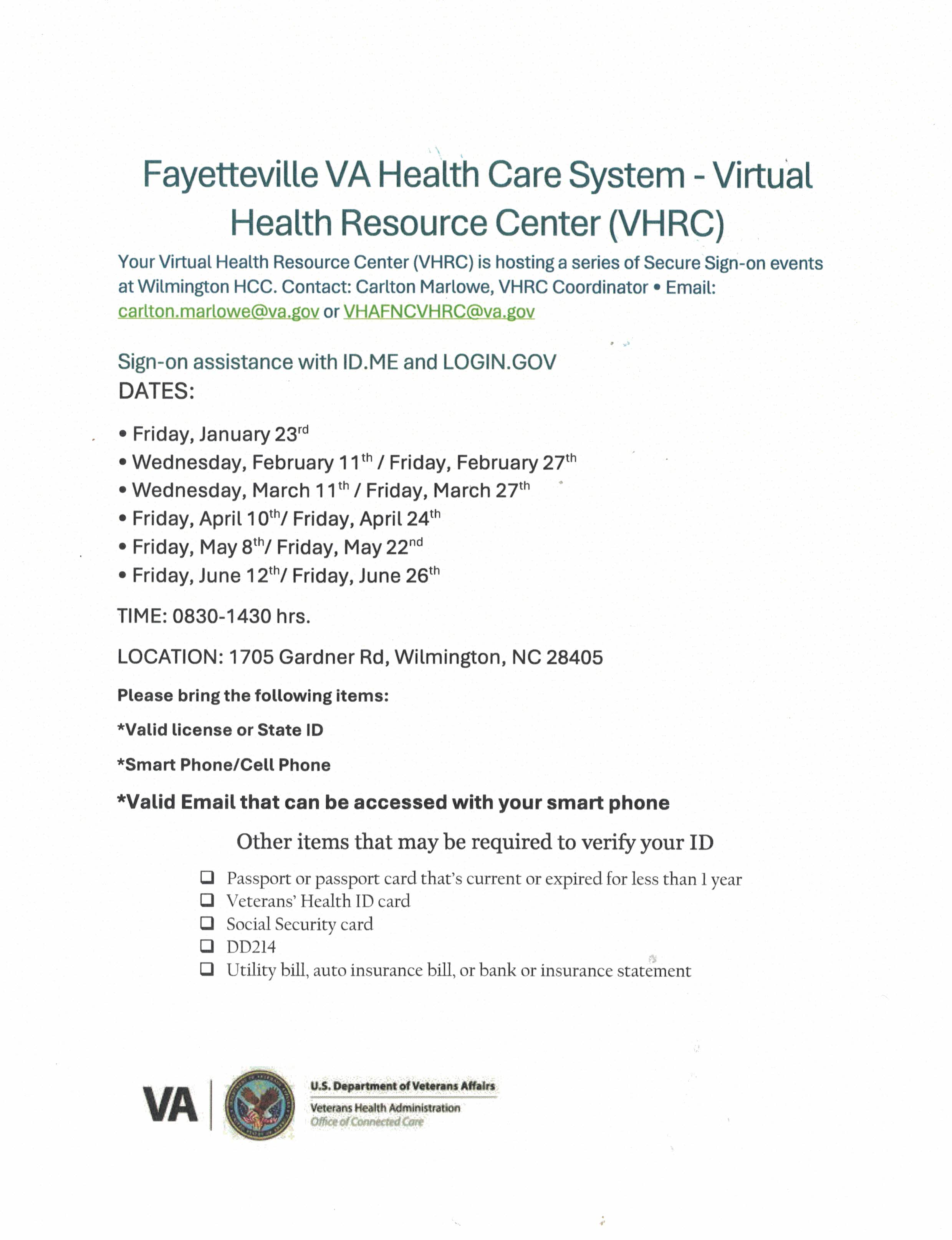 The Fayetteville VA Health Care System's Virtual Health Resource Center is hosting on-line events through June. These are in-person assistance to access the Virtual Health Resource Center.